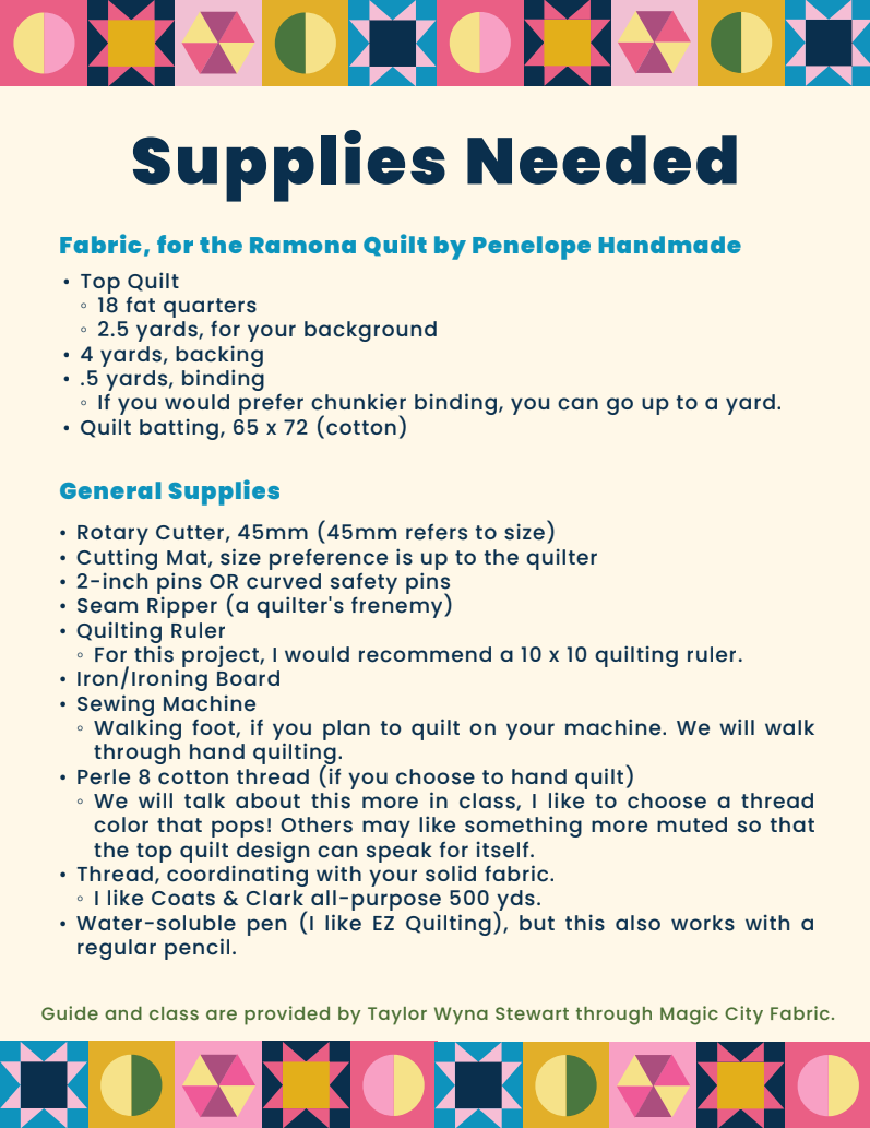Learn how to quilt with Taylor! Featuring the Ramona Quilt, you will learn how to construct a quilt from start to finish.