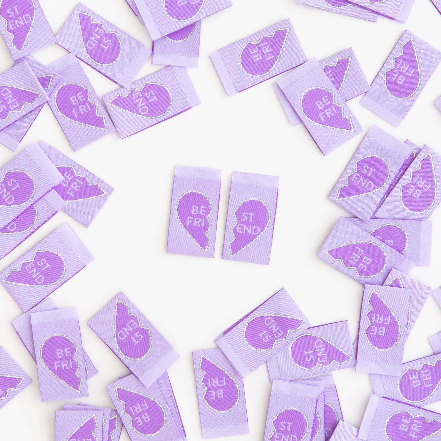 Wear your friendship heart on your sleeve, or anywhere else on your handmade garment! These lavender friendship heart tags are giving us all the middle-school BFF friendship necklace vibes in the best way possible. Each pack includes 8 woven labels, 4 of each half so you can make 4 matching tops, scrunchies, or anything your heart desires so you can twin with your bestie.