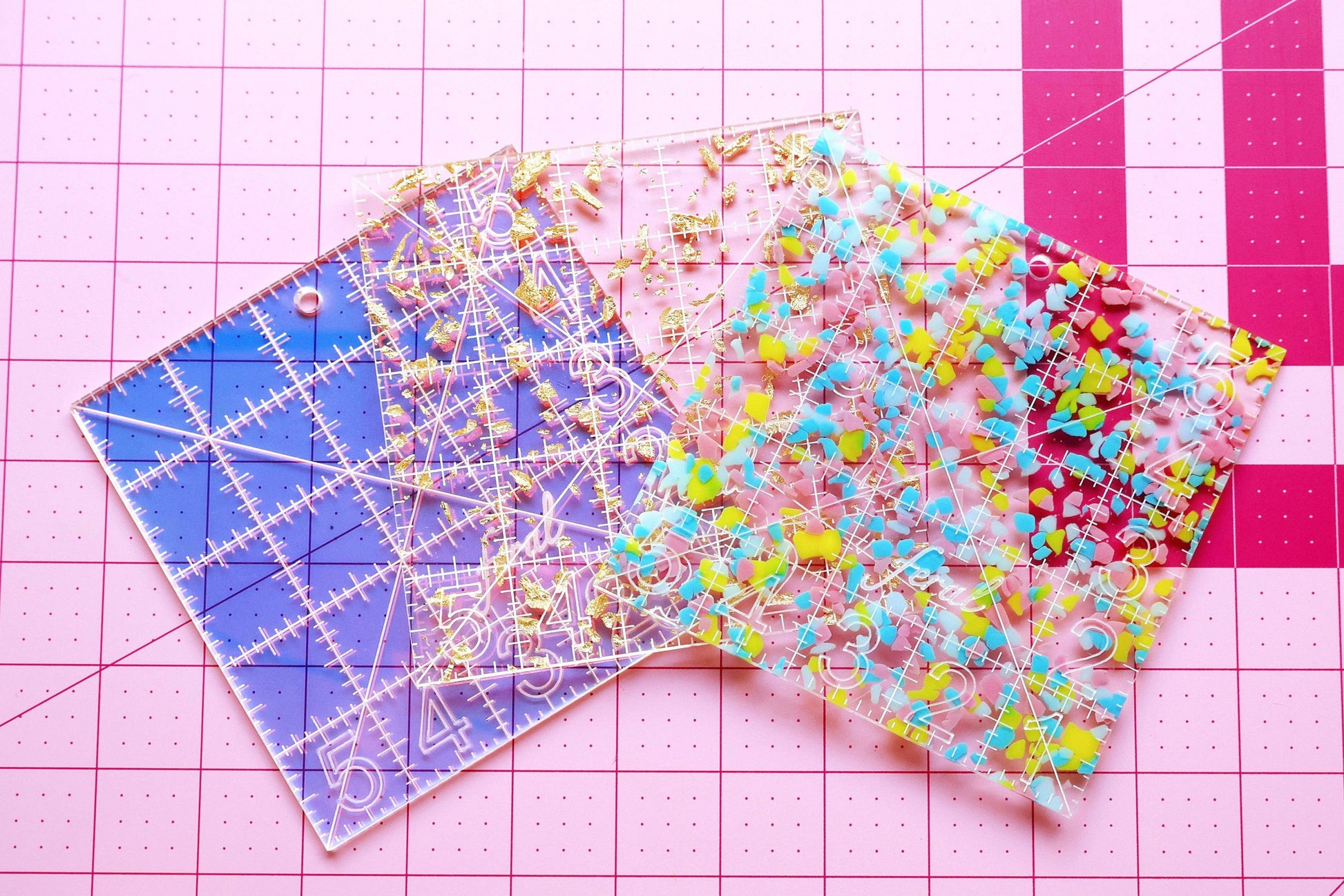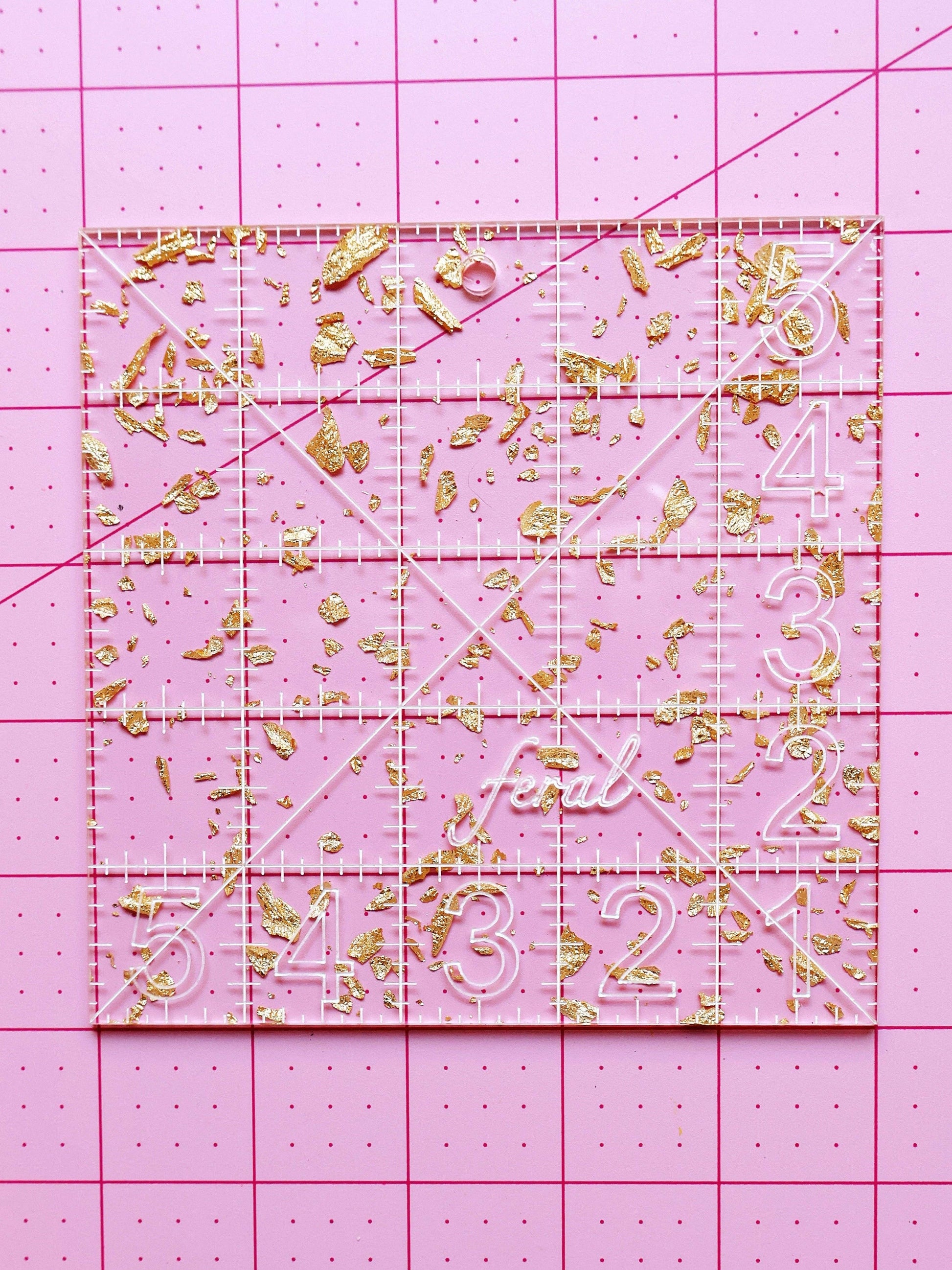 The Charm Ruler is a 5 inch square, perfect for trimming squares, HSTs, cutting scraps into nifty sizes, and trimming down strips. And doesn't she look pretty on a cutting mat?