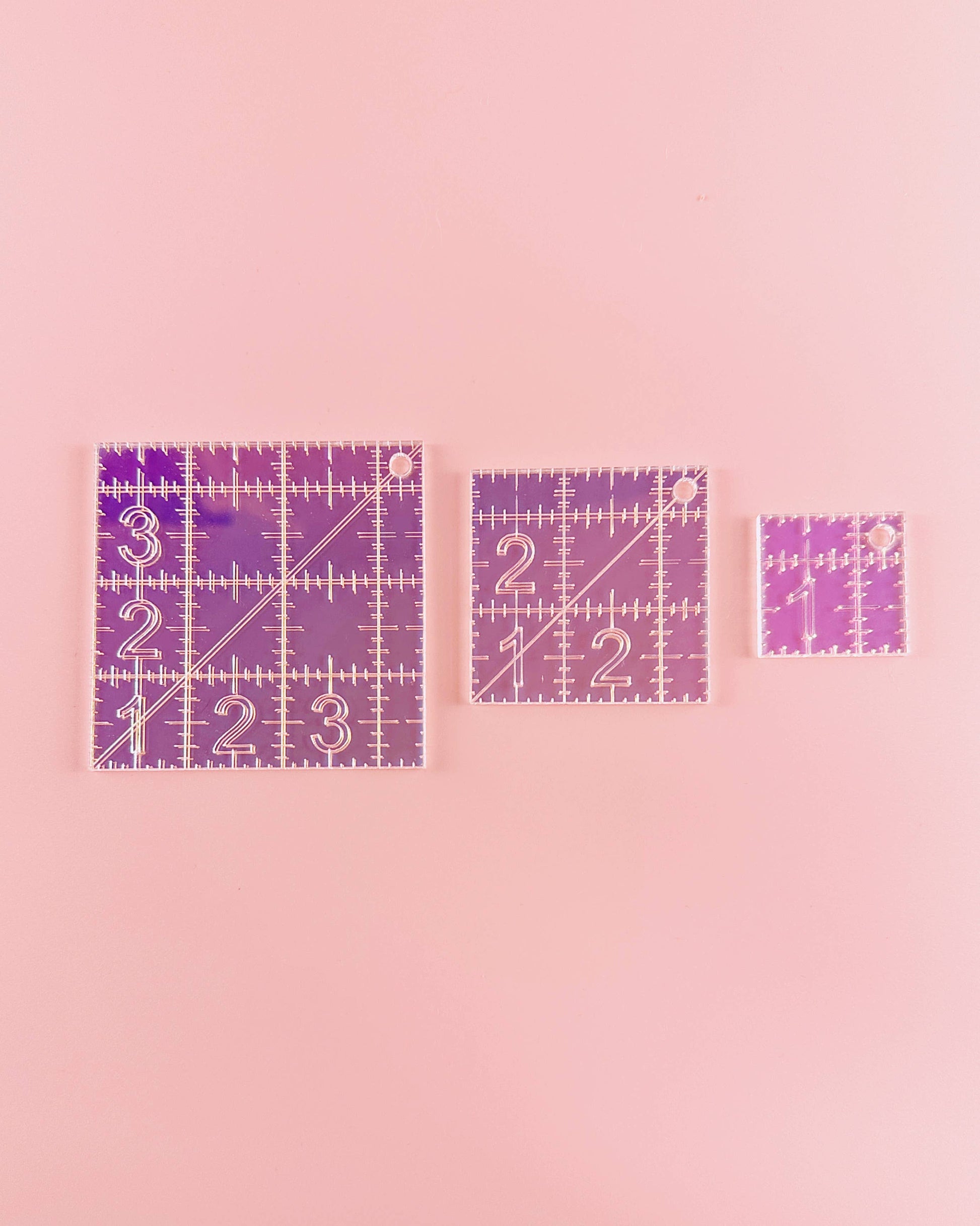 So small! So cute! And iridescent! Set of 3 mini square quilting rulers, in 1.5 inches, 2.5 inches, and 3.5 inches square. On a handy detachable ring. Markings are every 1/8 inch, with a diagonal line at 45 degrees for easy half square triangle trimming. This is a great size for trimming quilt binding! Laser cut and engraved from 1/8 inch acrylic. The markings are engraved so they'll never rub off. Non-slip dots provided with every ruler.