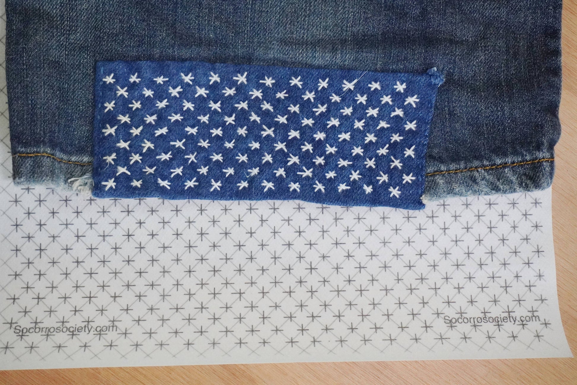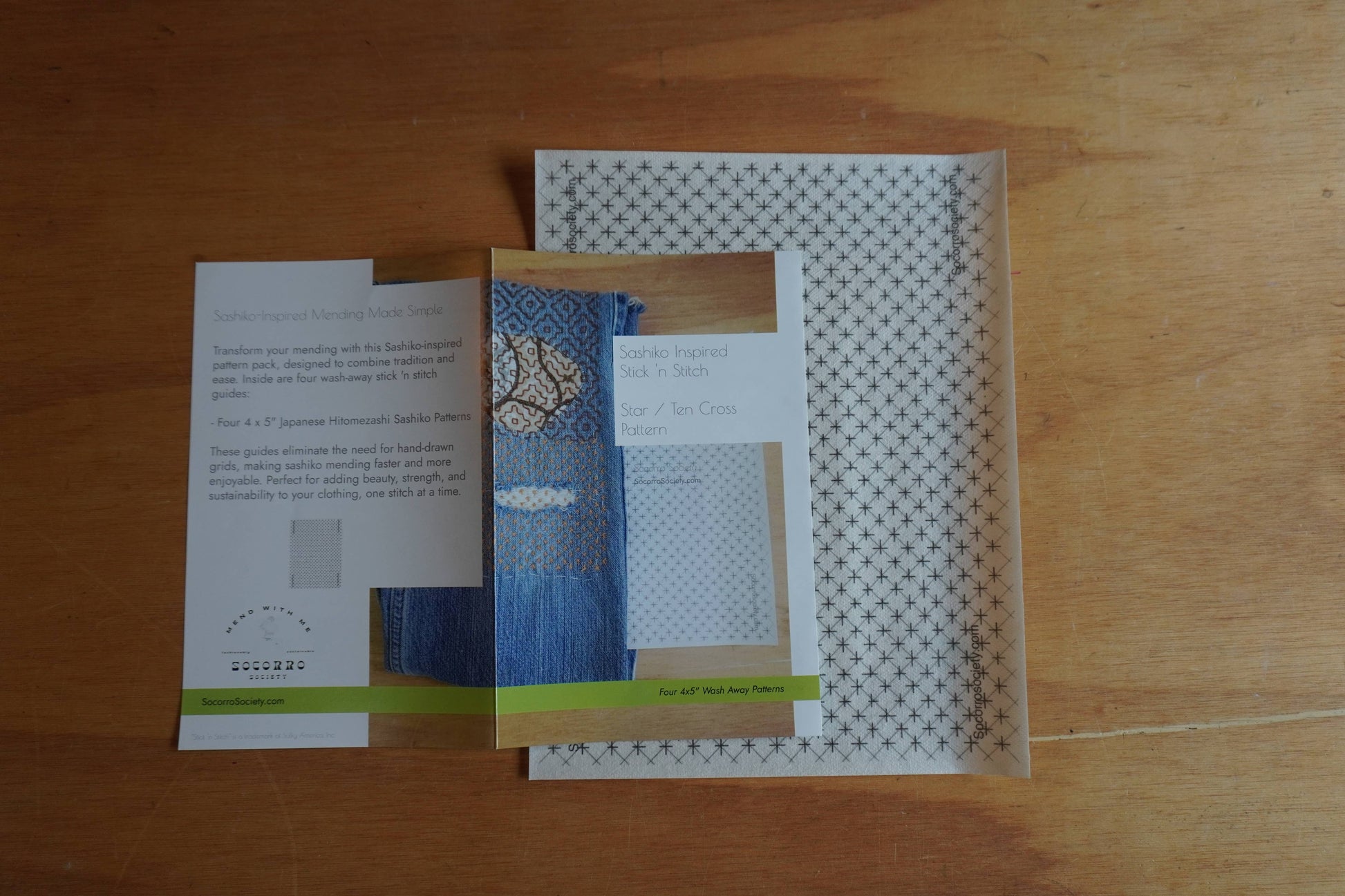 Upgrade your mending game with our Cross & Star Sashiko-Inspired Stick & Stitch Transfer. This large 8.5” x 11” Stick and Stitch wash-away embroidery pattern makes it easy to add beautiful, geometric stitching to clothing, denim, or accessories—no chalk, rulers, or tracing paper required. Simply peel, stick, stitch, and wash away for professional results. Ideal for visible mending, sashiko embroidery, and DIY clothing repair.